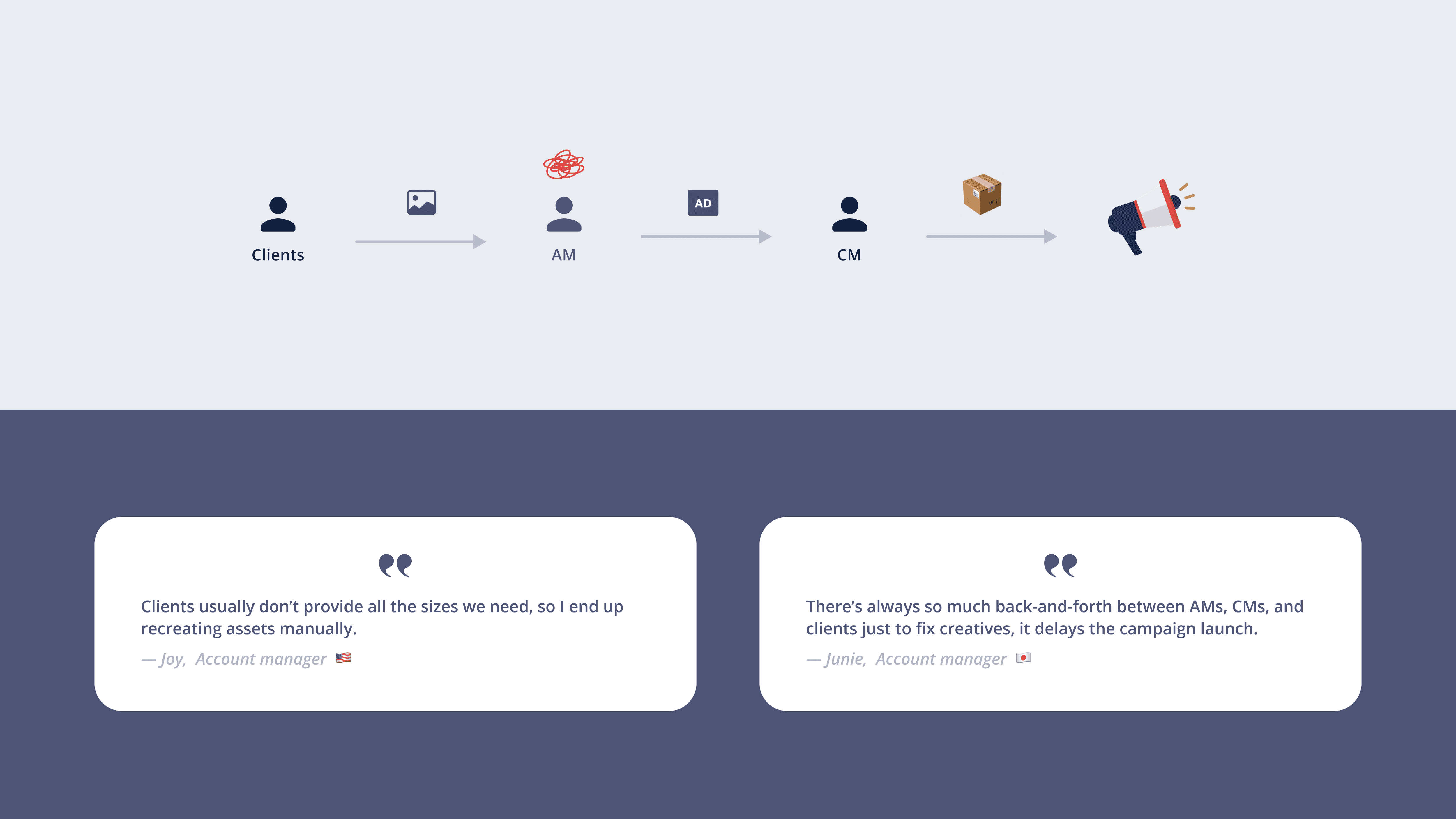 To design an effective tool, we first mapped the full workflow between AMs, CMs, and clients. This included documenting each step from asset submission to campaign setup, identifying where delays occurred, and understanding what AMs actually do behind the scenes to launch a campaign. These insights helped us pinpoint the UI flows the tool needed to support.