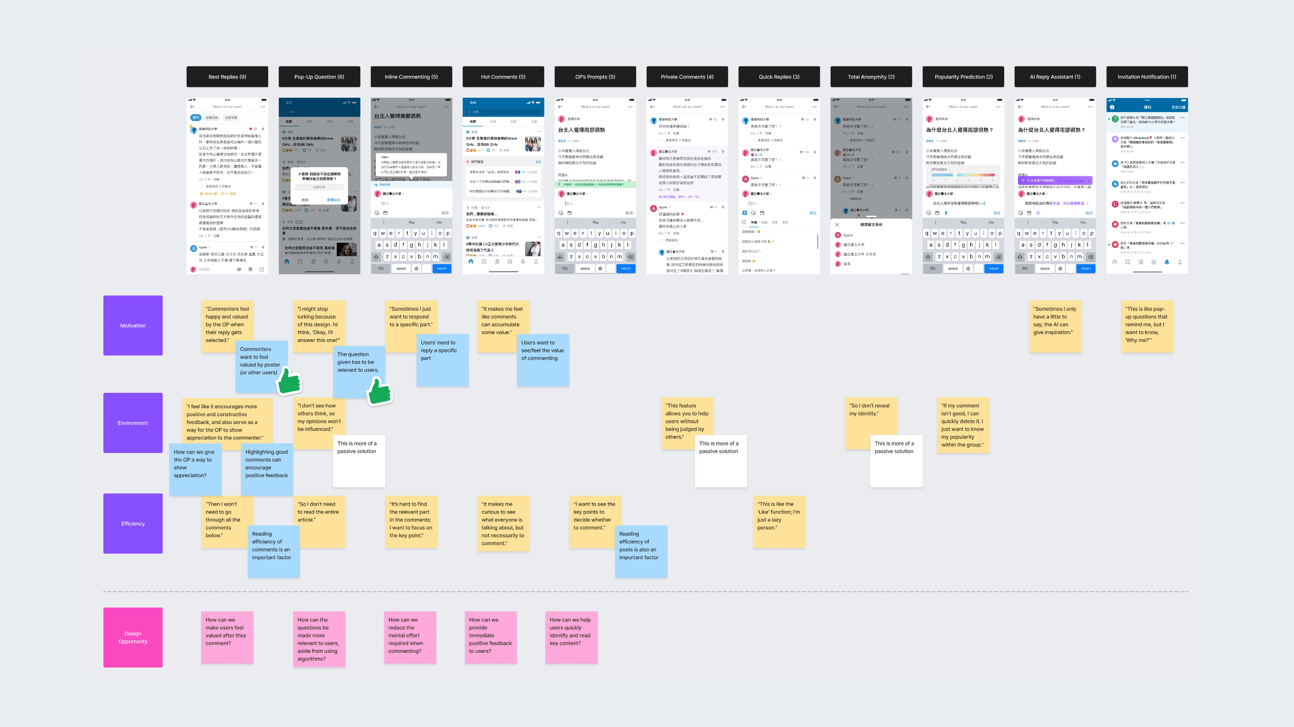 Instead of jumping into feature ideas, we focused on understanding what actually prevents users from participating. By synthesizing existing qualitative research and focus group insights, we examined how users experience the platform before, during, and after engaging with content. This helped us identify not just surface-level usability issues, but the emotional and cognitive costs users face when deciding whether to comment, respond, or share.